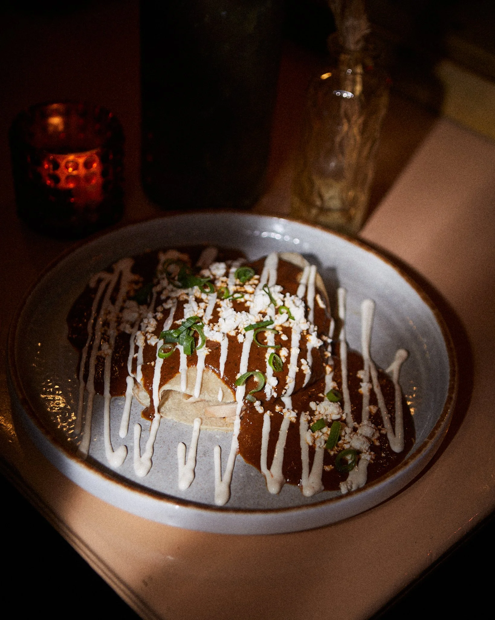 Chicken enchiladas in traditional mole sauce, crema, panela cheese